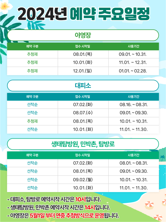 국립공원 예약통합시스템은 미리미리 계획을 세우고 예약을 진행함으로써 여러분의 여행을 보다 안락하고 편안하게 만들어줍니다. 시스템 이용 방법을 잘 숙지하여, 원하는 시기에 자연을 만끽해 보세요.