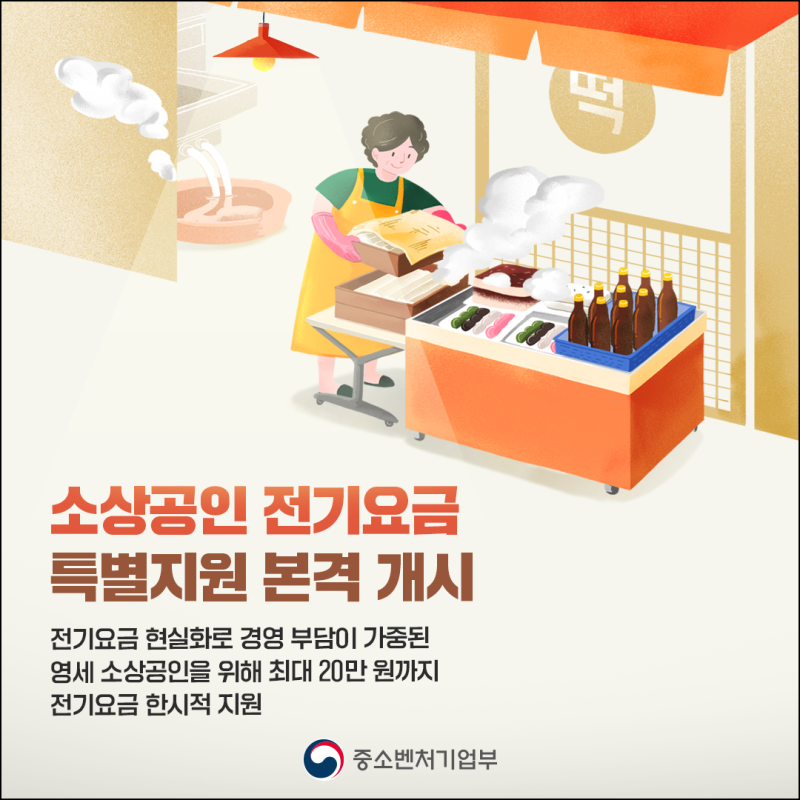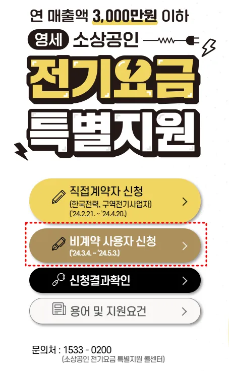 - 온라인 신청: 소상공인 전기요금 특별지원 사이트(소상공인전기요금특별지원.kr)에서 사업자 정보와 한국전력 고객 번호 등을 입력하여 신청합니다.