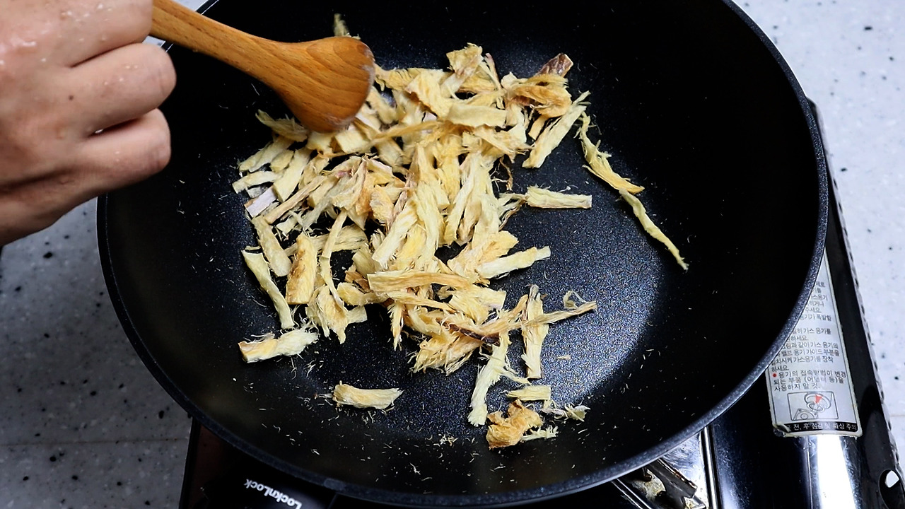 1. 참기름에 북어 볶기 : 불린 북어포는 참기름에 볶아 향을 내줍니다. 이 과정에서 북어의 고소한 맛이 살아납니다.