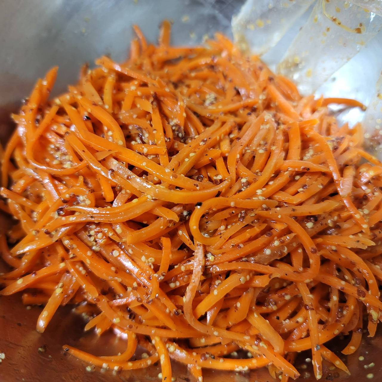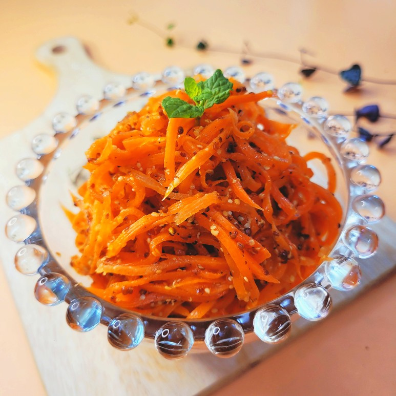 - 드레싱이 당근에 고르게 묻도록 손이나 큰 포크를 이용해 잘 섞습니다. 당근이 드레싱을 잘 흡수하도록 가볍게 버무리듯 섞어주세요.