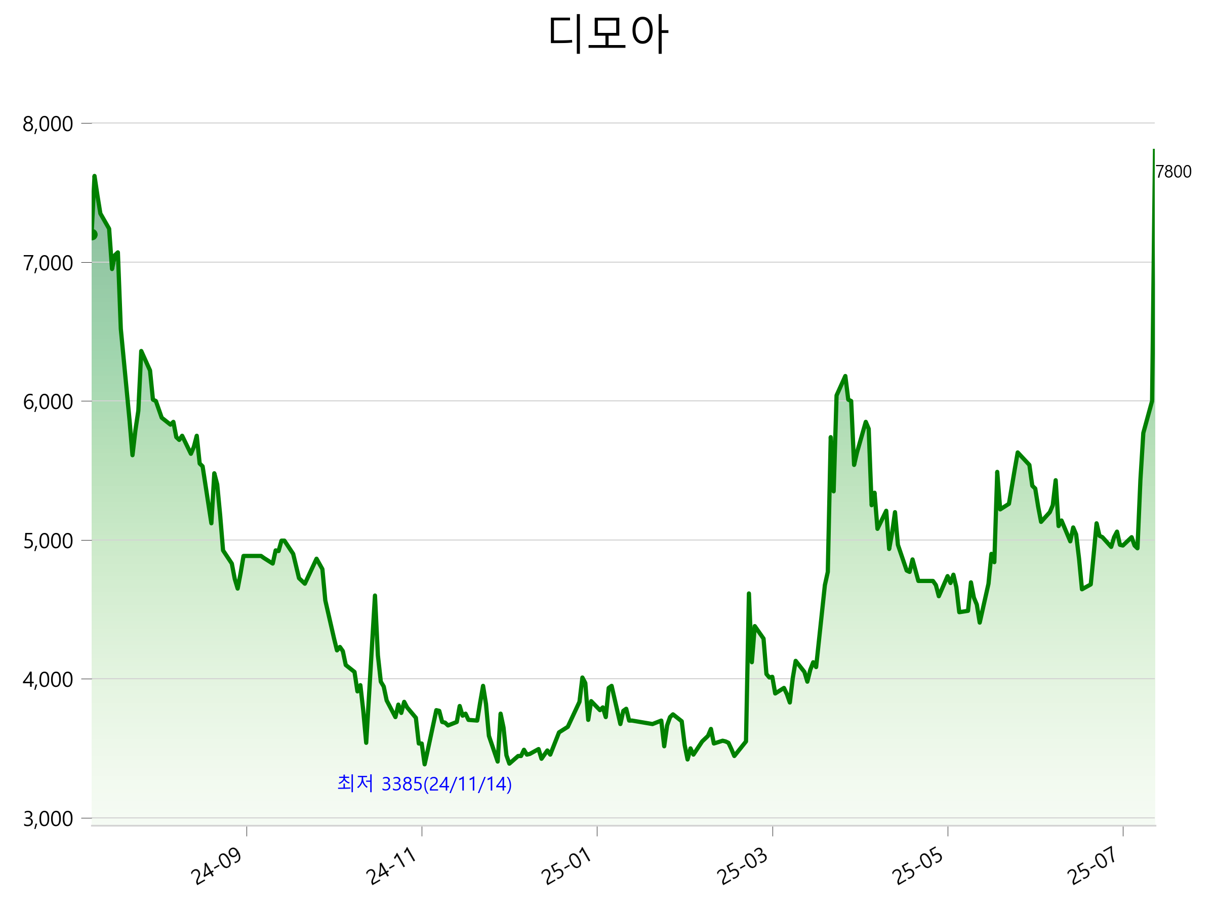 52주 최고가는 7,800원(2025-07-22), 52주 최저가는 3,385원(2024-11-14)으로 52주간 주가 상승률은 8.3% 입니다.