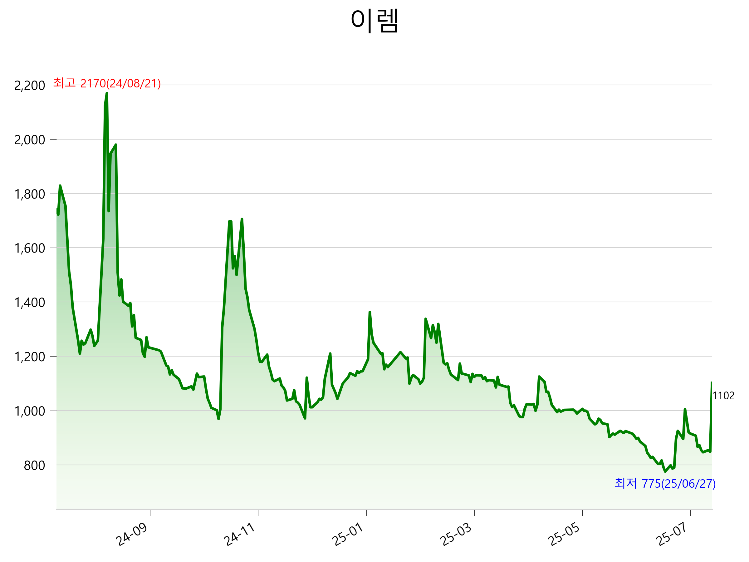 52주 최고가는 2,170원(2024-08-21), 52주 최저가는 775원(2025-06-27)으로 52주간 주가 상승률은 -36.7% 입니다.