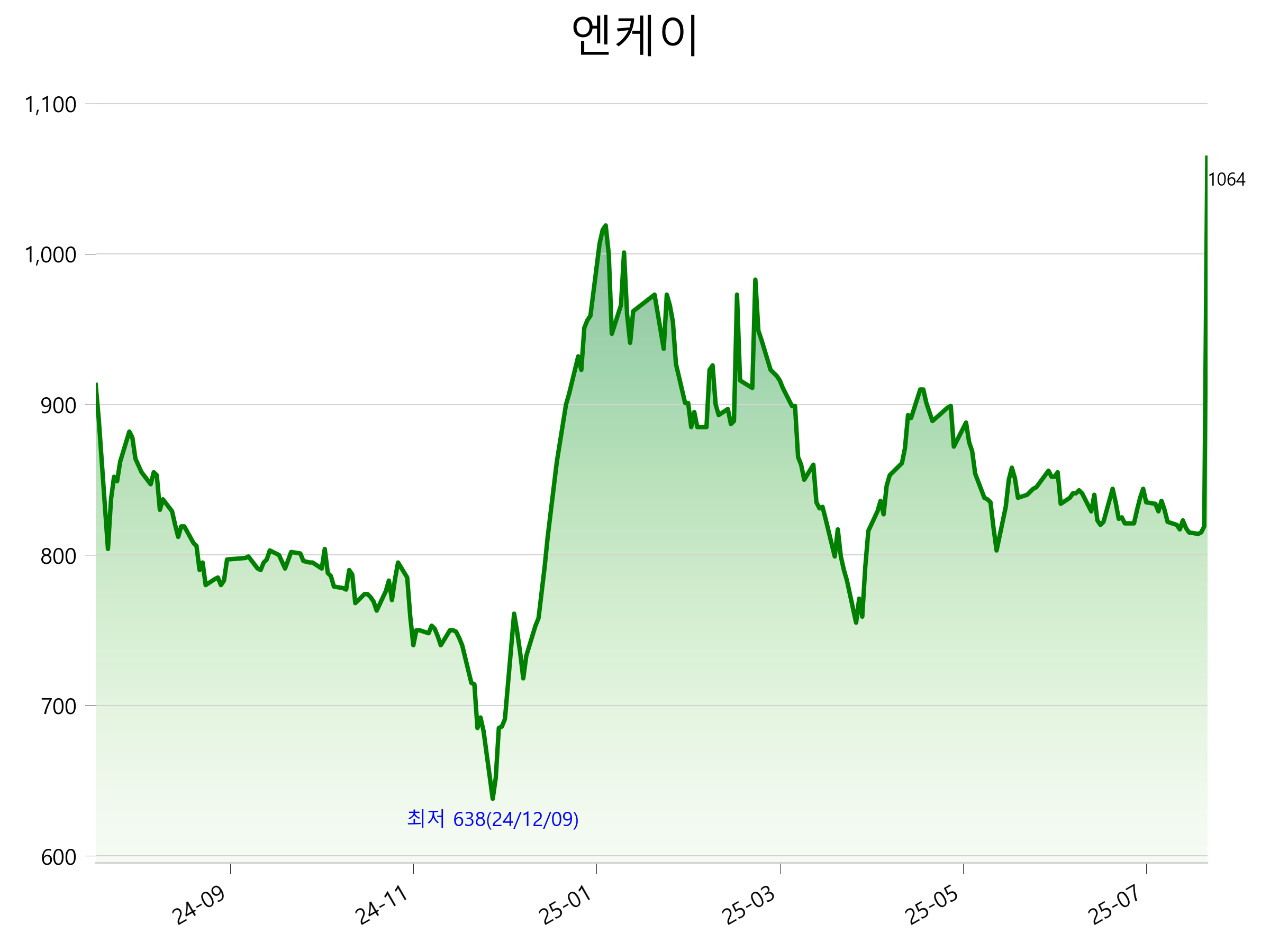 7월 31일 기준 주가는 1,064원 입니다. 아래는 최근 1년간의 주가흐름입니다.